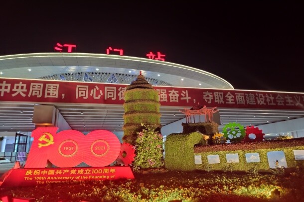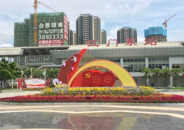在万达广场灯光秀亮灯庆祝“100周年”,滚动刊播宣传标语(“热烈庆祝中国共产党成立100周年”“永远跟党走”“伟大的中国共产党万岁”),6月26日上演并组织江门日报、江门广播电视台、南方日报、触电新闻等媒体制作主题短视频进行二次有效刊播。在新会玉湖、蓬江园山湖播放“100周年”主题水幕电影、音乐喷泉。同时,充分利用江门枢纽站、公园、市政和办公场所的亮化设施、设备,在晚上7时至11时,实施夜间亮灯(其中江门枢纽站亮灯至零时)。