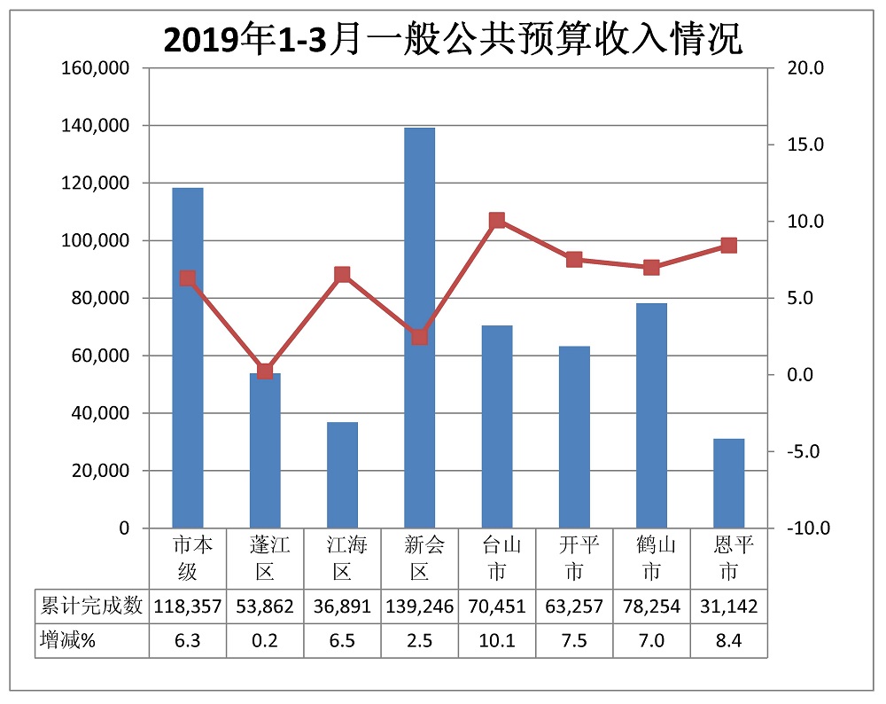 1-3月,全市一般公共预算支出完成107.94亿元,同比增长10.0%。市本级完成18.34亿元,增长5.6%。各市(区)完成情况:蓬江10.15亿元,增长14.2%;江海4.74亿元,增长13.5%;新会24.82亿元,增长10.0%;台山16.40亿元,增长10.8%;开平12.86亿元,增长10.0%;鹤山12.09亿元,增长10.0%;恩平8.55亿元,增长12.5%。
