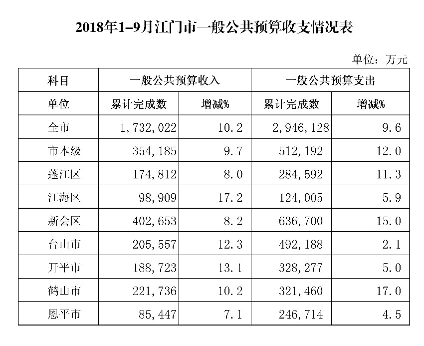 全市一般公共预算支出完成294.61亿元,同比增长9.6%。市本级完成51.22亿元,增长12%。各市(区)完成情况:蓬江28.46亿元,增长11.3%;江海12.4亿元,增长5.9%;新会63.67亿元,增长15%;台山49.22亿元,增长2.1%;开平32.83亿元,增长5%;鹤山32.15亿元,增长17%;恩平24.67亿元,增长4.5%。