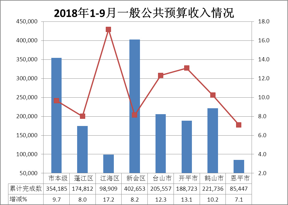 1-9月,全市一般公共预算收入完成173.2亿元,同比增长10.2%。其中税收收入完成122.37亿元,同比增长9.4%,占一般公共预算收入的比重为70.65%。市本级完成35.42亿元,增长9.7%。各市(区)完成情况:蓬江17.48亿元,增长8%;江海9.89亿元,增长17.2%;新会40.27亿元,增长8.2%;台山20.56亿元,增长12.3%;开平18.87亿元,增长13.1%;鹤山22.17亿元,增长10.2%;恩平8.54亿元,增长7.1%。