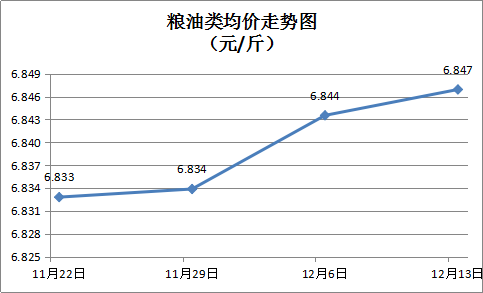 粮油类商品价格基本平稳。本周所监的15种粮油商品均价为6.85元/斤,周环比上涨0.05%。其中:晚籼米、珍珠米零售均价分别为每斤3.23元、3.08元,环比均持平;金龙鱼牌花生油(5L桶装)、调和油(5L桶装)零售均价分别为105.55元、64.21元,环比均持平。
