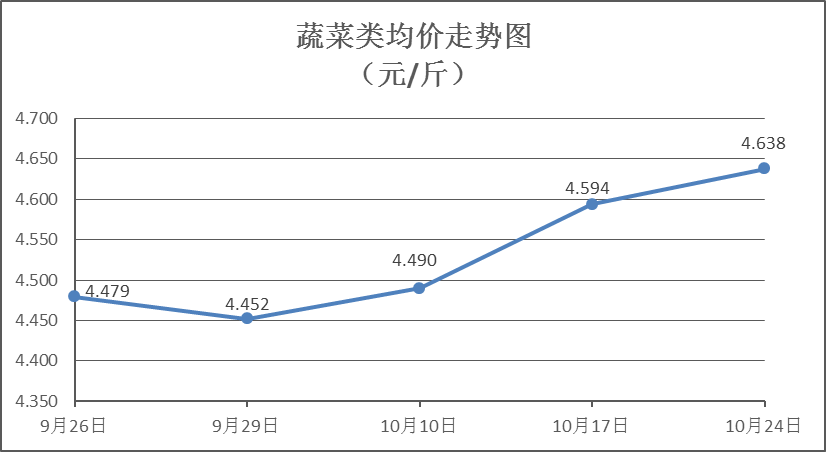 蔬菜类商品价格普遍上涨。本周所监测的32 种蔬菜商品价格波动情况为26涨6跌,综合零售均价为4.638元/斤,环比上涨0.95%。其中:涨幅居前的品种包括西红柿、椰菜、花菜,零售均价分别为每斤4.97元、2.86元、5.26元,环比分别上涨4.85%、3.25%、2.53%;跌幅居前的品种包括生菜、大白菜、莲藕,零售均价分别为每斤3.98元、3.07元、5.54元,环比分别下降1.73%、0.97%、0.72%。