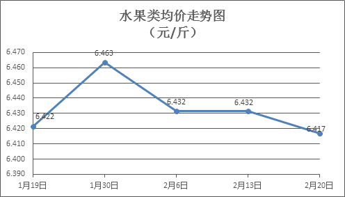 水果类商品价格窄幅盘整。本周所监测的6种水果商品价格波动情况为2涨3跌1平,综合零售均价为6.417元/斤,环比下降0.23%。其中苹果、香蕉、梨零售均价分别为每斤7.13元、3.05元、6.01元,环比分别上涨0.28%、下降0.97%、下降1.31%。