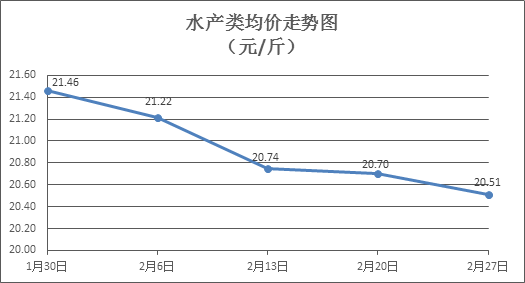 水产类商品价格小幅下降。本周所监测的10种水产商品价格波动情况为1涨8跌1平,综合均价为20.51元/斤,环比下降0.91%。其中:草鱼、鲫鱼、鲈鱼、基围虾零售均价分别为每斤11.18元、14.05元、18.86元、38.63元,环比分别下降1.24%、下降0.92%、下降2.58%、上涨0.73%。