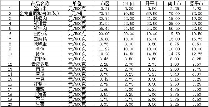 说明:1、表中价格为该地区监测点综合平均价;2、“市区”含蓬江区、江海区、新会区,价格分别采自蓬江市场、江南市场、城东市场等13家农贸市场;3、其他四个县市价格分别采自新华市场、锦江市场等8家农贸市场。