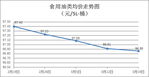 食用油类商品价格稳中微降。本周所监测的9种食用油(5L装)商品价格波动情况为6跌3平,综合零售均价为96.86元/桶,环比下降0.05%。其中:鲁花花生油、金龙鱼调和油零售均价分别为每桶157.48元、71.46元,环比分别下降0.02%、持平。