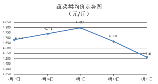 据本市21家农贸市场监测数据显示,上周3月13日至3月19日(下同)市场上各类“菜篮子”商品供应充足,所监测的7大类“菜篮子”商品价格2涨4跌1平。其中:粮食类商品价格保持稳定,食用油类、肉菜类、水产类商品价格总体略降,禽蛋类、水果类商品价格略有上涨。从节日效应及需求情况来看,近期禽蛋类及水果类商品价格有一定的上涨基础。