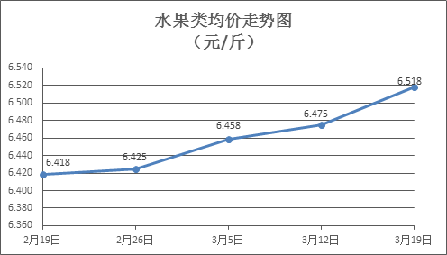 水果类商品价格有所上涨。本周所监测的6种水果商品价格均上涨,综合零售均价为6.518元/斤,环比上涨0.67%。其中苹果、香蕉、梨零售均价分别为每斤7.15元、3.14元、6.04元,环比分别上涨0.28%、上涨0.64%、上涨0.50%。