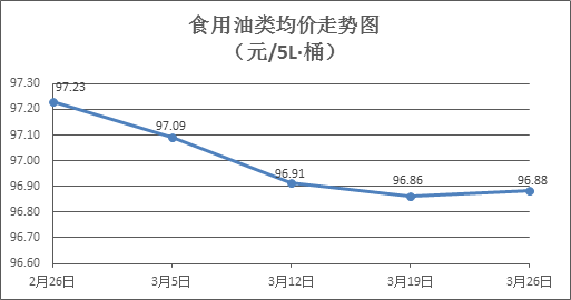 食用油类商品价格微幅波动。本周所监测的9种食用油(5L装)商品价格波动情况为1升6降2平,综合零售均价为96.88元/桶,环比上涨0.02%。其中:胡姬花花生油、大豆油零售均价分别为每桶145.83元、61.53元,环比分别上涨0.57%、下降0.18%。