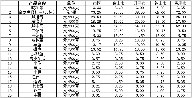 说明:1、表中价格为该地区监测点综合平均价;2、“市区”含蓬江区、江海区、新会区,价格分别采自蓬江市场、江南市场、城东市场等13家农贸市场;3、其他四个县市价格分别采自新华市场、锦江市场等8家农贸市场。