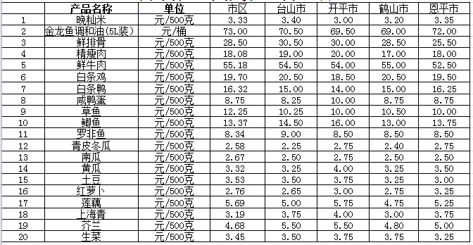说明:1、表中价格为该地区监测点综合平均价;2、“市区”含蓬江区、江海区、新会区,价格分别采自蓬江市场、江南市场、城东市场等13家农贸市场;3、其他四个县市价格分别采自新华市场、锦江市场等8家农贸市场。