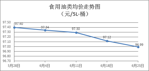 食用油类商品价格总体略降。上周所监测的9种食用油(5L装)商品价格波动情况为2涨6跌1平,综合零售均价为96.99元/桶,环比下降0.12%。其中:鲁花花生油、金龙鱼调和油零售均价分别为每桶157.30元、71.46元,环比分别下降0.03%、下降0.11%。
