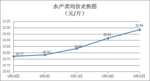 水产类商品价格有所上涨。上周所监测的10种水产商品价格波动情况为7涨1跌2平,综合均价为20.99元/斤,环比上涨0. 33%。其中:草鱼、鲢鱼、鳙鱼、罗非鱼、基围虾零售均价分别为每斤11.06元、10.00元、10.19元、8.55元、39.08元,环比分别上涨0.27%、上涨0.60%、上涨0.59%、上涨0.94%、下降0.38%。