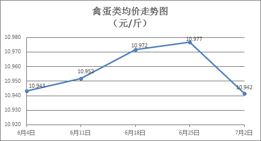 禽蛋类商品价格有所回落。上周所监测的6种禽蛋类商品价格波动情况为5跌1平,综合零售均价为10.942元/斤,环比下降0.32%。其中:白条鸡、白条鸭零售均价分别为每斤19.83元、15.56元,环比分别下降0.05%、下降0.83%;白壳鸡蛋、鸭蛋零售均价分别为每斤6.70元、7.90元,环比分别下降0.30%、持平。
