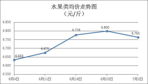 水果类商品价格小幅波动。上周所监测的6种水果商品价格波动情况为2涨3跌1平,综合零售均价为6.763元/斤,环比下降0.54%。其中苹果、香蕉、梨零售均价分别为每斤7.44元、3.21元、6.43元,环比分别持平、下降0.62%、上涨1.42%。