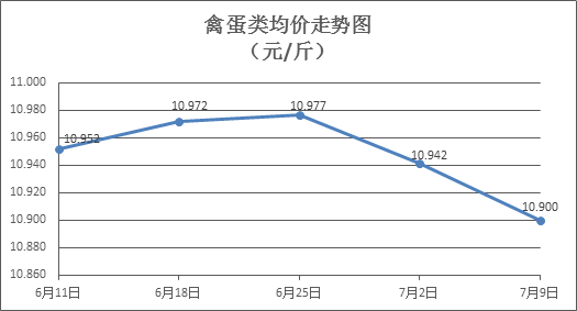 禽蛋类商品价格普遍下降。上周所监测的6种禽蛋类商品价格波动情况为1涨5跌,综合零售均价为10.900元/斤,环比下降0.38%。其中:白条鸡、白条鸭零售均价分别为每斤19.75元、15.41元,环比分别下降0.40%、下降0.96%;白壳鸡蛋、鸭蛋零售均价分别为每斤6.68元、7.93元,环比分别下降0.30%、上涨0.38%。