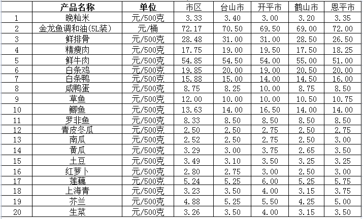 说明:1、表中价格为该地区监测点综合平均价;2、“市区”含蓬江区、江海区、新会区,价格分别采自蓬江市场、江南市场、城东市场等13家农贸市场;3、其他四个县市价格分别采自新华市场、锦江市场等8家农贸市场。