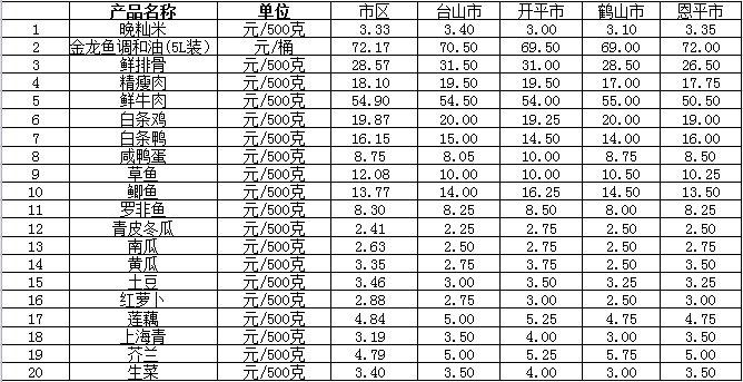 说明:1、表中价格为该地区监测点综合平均价;2、“市区”含蓬江区、江海区、新会区,价格分别采自蓬江市场、江南市场、城东市场等13家农贸市场;3、其他四个县市价格分别采自新华市场、锦江市场等8家农贸市场。