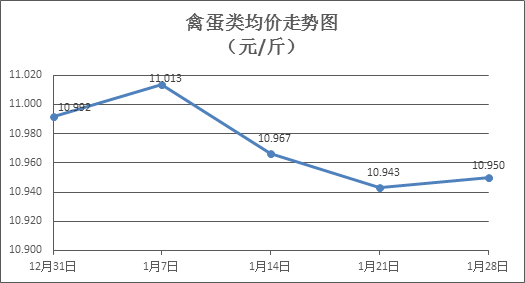 禽蛋类商品价格略有回升。上周所监测的6种禽蛋类商品价格波动情况为4涨2跌,综合零售均价为10.950元/斤,环比上涨0.06%。其中:白条鸡、白条鸭零售均价分别为每斤20.10元、15.13元,环比分别上涨0.05%、上涨0.13%;白壳鸡蛋、鸭蛋零售均价分别为每斤6.77元、7.67元,环比分别上涨0.74%、下降0.39%。