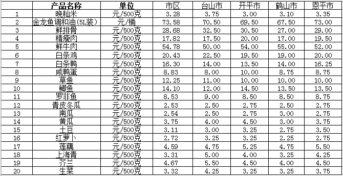 说明:1、表中价格为该地区监测点综合平均价;2、“市区”含蓬江区、江海区、新会区,价格分别采自蓬江市场、江南市场、城东市场等13家农贸市场;3、其他四个县市价格分别采自新华市场、锦江市场等8家农贸市场。