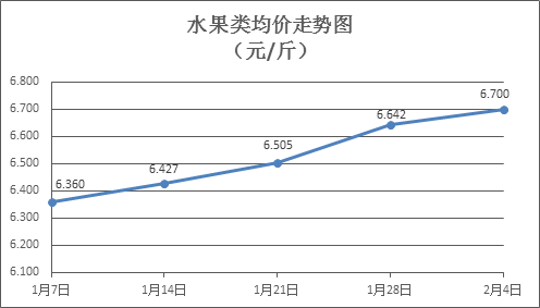 水果类商品价格总体略涨。上周所监测的6种水果商品价格波动情况为5涨1跌,综合零售均价为6.700元/斤,环比上涨0.88%。其中橙子、苹果、葡萄零售均价分别为每斤5.17元、7.49元、15.43元,环比分别上涨0.39%、上涨0.27%、上涨1.51%。