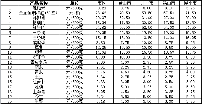 说明:1、表中价格为该地区监测点综合平均价;2、“市区”含蓬江区、江海区、新会区,价格分别采自蓬江市场、江南市场、城东市场等13家农贸市场;3、其他四个县市价格分别采自新华市场、锦江市场等8家农贸市场。