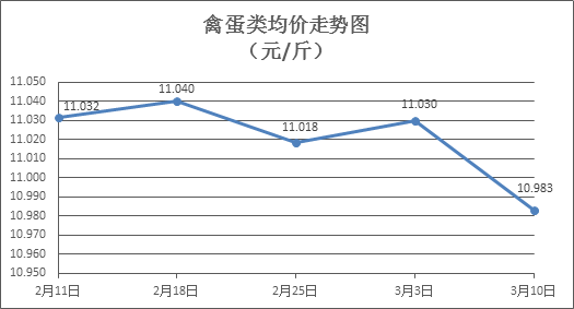 禽蛋类商品价格略有下降。上周所监测的6种禽蛋类商品价格波动情况为1涨3跌2平,综合零售均价为10.983元/斤,环比下降0.42%。其中:白条鸡、白条鸭零售均价分别为每斤20.29元、15.06元,环比分别下降0.59%、下降0.79%;白壳鸡蛋、鸭蛋零售均价分别为每斤6.58元、7.69元,环比分别下降0.75%、持平。