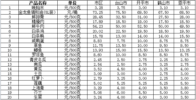 说明:1、表中价格为该地区监测点综合平均价;2、“市区”含蓬江区、江海区、新会区,价格分别采自蓬江市场、江南市场、城东市场等13家农贸市场;3、其他四个县市价格分别采自新华市场、锦江市场等8家农贸市场。