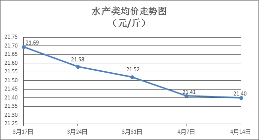 水产类商品价格小幅波动。所监测的10种水产商品价格波动情况为3涨5跌2平,综合均价为每斤21.40元,环比下降0.06%。其中:草鱼、鲫鱼、罗非鱼、基围虾零售均价分别为每斤11.21元、14.16元、8.80元、33.66元,环比分别下降0.71%、下降0.21%、上涨0.11%、下降0.94%。
