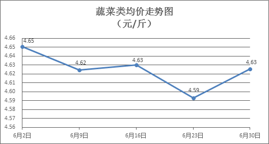 蔬菜类商品价格升降互现。所监测的32 种蔬菜商品价格波动情况为18涨14跌,综合零售均价为每斤4.63元,环比上涨0.71%。其中:涨幅居前的品种包括黄瓜、韭菜、丝瓜,零售均价分别为每斤3.79元、5.01元、4.95元,环比分别上涨11.14%、6.82%、3.34%;跌幅靠前的品种包括花菜、西红柿、生菜,零售均价分别为每斤4.53元、4.28元、3.83元,环比分别下降3.00%、1.83%、1.54%。