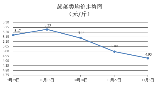 蔬菜类商品价格继续回调。所监测的32 种蔬菜商品价格波动情况为10涨22跌,综合零售均价为每斤4.93元,环比下降1.37%。其中:价格涨幅靠前的品种包括丝瓜、青豆角、莲藕,零售均价分别为每斤4.65元、5.34元、5.23元,环比分别上涨5.06%、1.81%、0.87%;跌幅靠前的品种包括菠菜、西洋菜、西红柿,零售均价分别为每斤6.82元、5.60元、5.70元,环比分别下降6.87%、5.39%、5.09%。