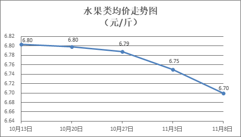 水果类商品价格继续下降。所监测的6种水果商品价格波动情况为2涨4跌,综合零售均价为每斤6.70元,环比下降0.70%。其中橙子、苹果、香蕉零售均价分别为每斤6.42元、7.45元、3.24元,环比分别下降3.79%、上涨0.35%、下降1.07%。