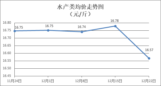 水产类商品价格总体略降。所监测的9种水产商品价格波动情况为1涨7跌1平,综合均价为每斤16.57元,环比下降1.26%。其中:草鱼、鲫鱼、罗非鱼、鳙鱼、基围虾零售均价分别为每斤11.07元、13.99元、9.12元、10.76元、29.45元,环比分别持平、下降0.78%、上涨0.33%、下降0.74%、下降0.64%。