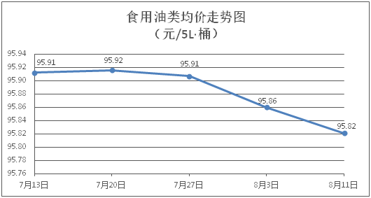 食用油类商品价格稳中微降。所监测的9种食用油(5L装)商品价格波动情况为1涨4跌4平,综合零售均价为每桶95.82元,环比下降0.04%。其中:金龙鱼花生油、金龙鱼调和油零售均价为每桶102.62元、70.82元,环比分别下降0.20%、下降0.10%。