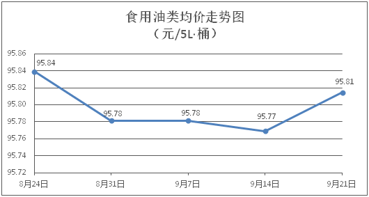 食用油类商品价格微幅上涨。所监测的9种食用油(5L装)商品价格波动情况为6涨1跌2平,综合零售均价为每桶95.81元,环比上涨0.05%。其中:鲁花花生油、菜籽油零售均价分别为每桶156.49元、73.53元,环比分别上涨0.04%、上涨0.01%。