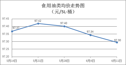 食用油类商品价格稳中略降。上周所监测的9种食用油(5L装)商品价格波动情况为1涨5跌3平,综合零售均价为97.30元/桶,环比下降0.05%。其中:花生油、调和油零售均价分别为每桶115.75元、63.60元,环比分别下降0.07%、下降0.19%。