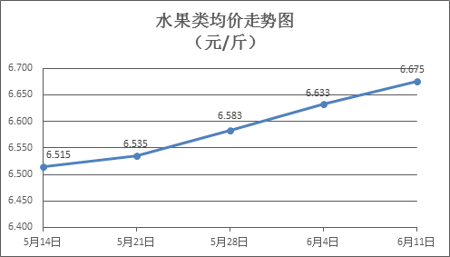 水果类商品价格总体略涨。上周所监测的6种水果商品价格波动情况为4涨2跌,综合零售均价为6.675元/斤,环比上涨0.63%。其中苹果、香蕉、葡萄零售均价分别为每斤7.38元、3.24元、13.63元,环比分别下降0.54%、上涨0.93%、上涨1.49%。