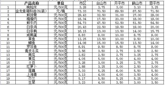 说明:1、表中价格为该地区监测点综合平均价;2、“市区”含蓬江区、江海区、新会区,价格分别采自蓬江市场、江南市场、城东市场等13家农贸市场;3、其他四个县市价格分别采自新华市场、锦江市场等8家农贸市场。