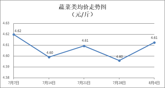 蔬菜类商品价格涨多跌少。所监测的32 种蔬菜商品价格波动情况为21涨9跌2平,综合零售均价为每斤4.61元,环比上涨0.36%。其中:涨幅居前的品种包括莴笋、青豆角、丝瓜,零售均价分别为每斤3.95元、5.06元、4.45元,环比分别上涨3.40%、3.27%、2.77%;跌幅靠前的品种包括茄子、苦瓜、花菜,零售均价分别为每斤3.99元、4.30元、4.76元,环比分别下降3.39%、3.37%、2.66%。
