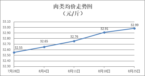 肉类商品价格微幅上涨。所监测的8种肉类商品价格波动情况为6涨2跌,综合零售均价为每斤32.99元,环比上涨0.22%。其中:排骨、精瘦肉、牛肉、带骨羊肉零售均价分别为每斤32.84元、20.34元、45.46元、43.38元,环比分别上涨0.74%、上涨0.74%、上涨0.11%、下降0.12%。