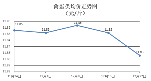 禽蛋类商品价格微幅下降。所监测的5种禽蛋类商品价格波动情况为1涨3跌1平,综合零售均价为每斤11.83元,环比下降0.15%。其中:白条鸡、白条鸭零售均价分别为每斤20.56元、15.22元,环比分别上涨0.15%、下降0.52%;鸡蛋、鸭蛋零售均价分别为每斤6.55元、7.67元,环比分别持平、下降0.26%。