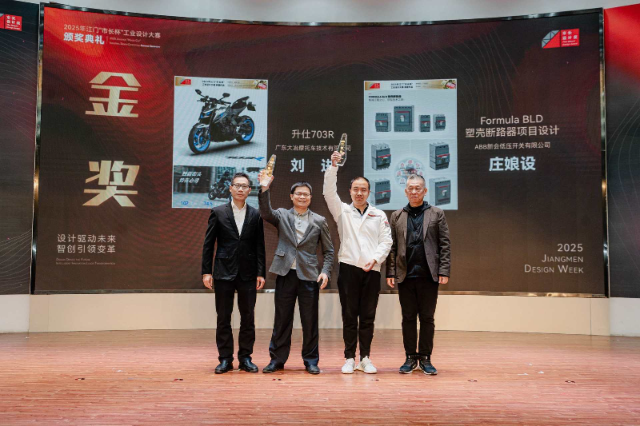 麦敏杰副秘书长、张斌副局长等大赛组委会成员为18家获奖企业以及十大工业设计师颁发了奖项。其中,广东大冶摩托车技术有限公司的“升仕703R”、ABB新会低压开关有限公司的“FormulaBLD塑壳断路器项目设计”等18件作品获得铜奖及以上奖项;刘新华、彭华亮等10位设计师获得“十大工业设计师”荣誉。