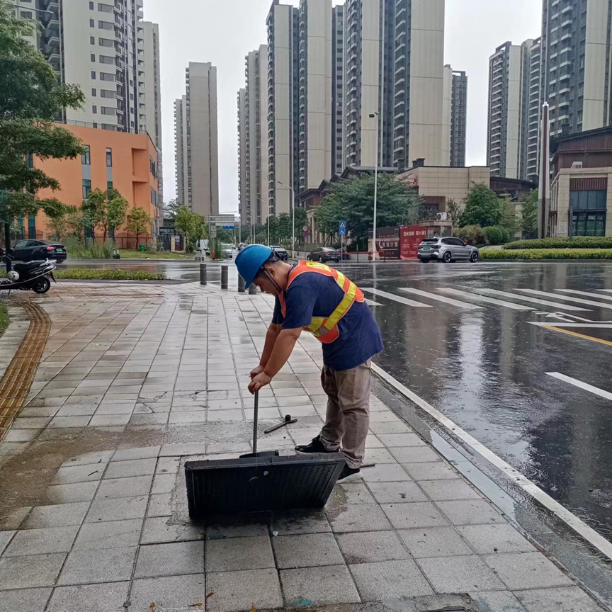 ▲花木公司对圭峰山低洼点路面的沙井盖堵塞物进行清理。