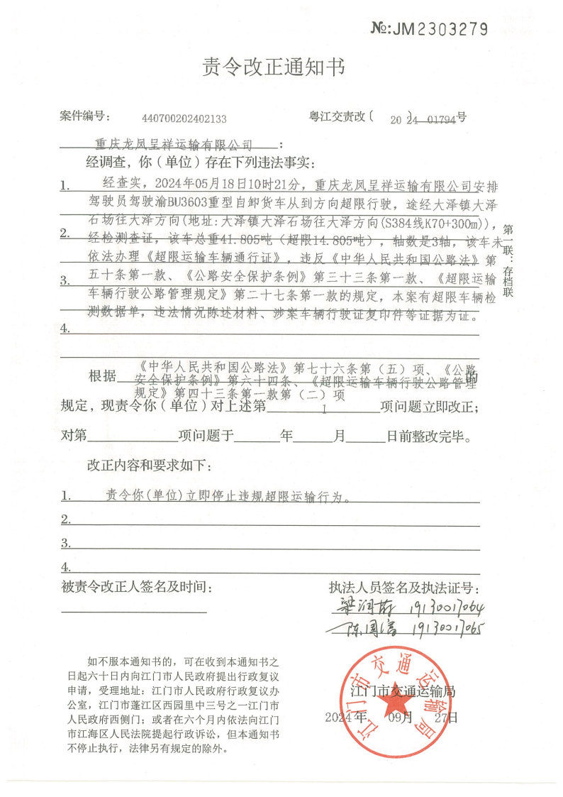 你(单位)因违反交通运输行政管理法规,本机关已作出行政处罚决定和责令改正通知书(具体内容详见附件)。依照《中华人民共和国民事诉讼法》第九十五条的规定,因受送达人采用其他方式无法送达,现向你(单位)公告送达《行政处罚决定书》和《责令改正通知书》。自公告之日起,经过30日即视为送达。