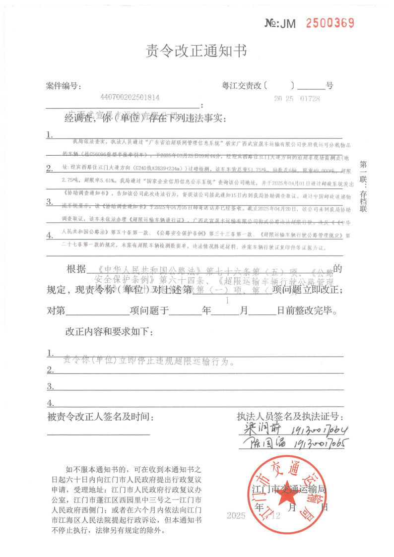 你(单位)因违反交通运输行政管理法规,本机关已作出行政处罚决定和责令改正通知书(具体内容详见附件)。依照《中华人民共和国民事诉讼法》第九十五条的规定,因无法以其他方式向你(单位)送达,现向你(单位)公告送达《行政处罚决定书》和《责令改正通知书》。自发出公告之日起,经过30日即视为送达。