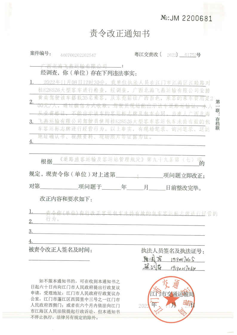 你(单位)因违反交通运输行政管理法规,本机关已作出行政处罚决定和责令改正通知书(具体内容详见附件)。依照《中华人民共和国民事诉讼法》第九十二条的规定,因受送达人采用其他方式无法送达,现向你(单位)公告送达《行政处罚决定书》和《责令改正通知书》。自公告之日起,经过30日即视为送达。