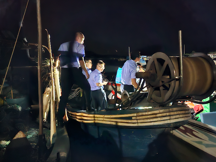 休渔首月,江门支队“海陆空”协同出击,采取海上执法巡查、岸上蹲点堵截、空中无人机侦察等方式,从严整治应休渔船出海偷捕、涉渔“三无”船舶非法捕捞、免休渔船“钓改拖、钓改刺、钓改笼”、渔船跨海区作业生产等违法行为。行动期间,江门支队充分发挥“省市县三级海综部门纵向执法联动”和“海综、公安、海警三部门横向执法联动”机制效能,通过协同作战、组团作战,对违法偷捕船舶和涉渔“三无”船舶进行全面打击。其中,5月10日,在省总队统一指导下,江门支队组织台山大队,联合公安打私部门和属地政府,在台山赤溪、深井两镇一举查获涉渔“三无”船舶19艘。