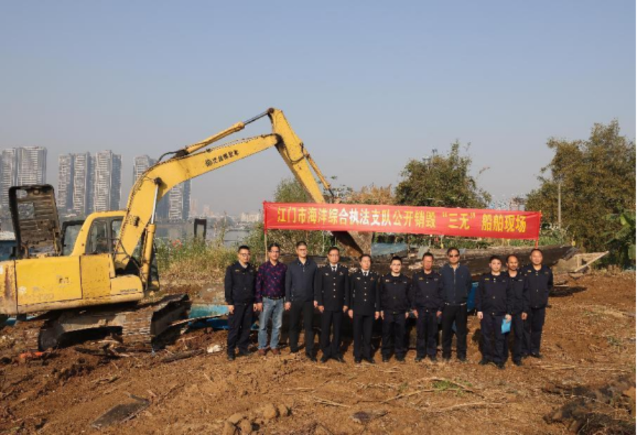 1月15日,市海洋综合执法支队在蓬江区潮连街道举办2024年拆解销毁涉渔“三无”船舶现场会,集中销毁前期依法没收的85艘涉渔“三无”船舶。