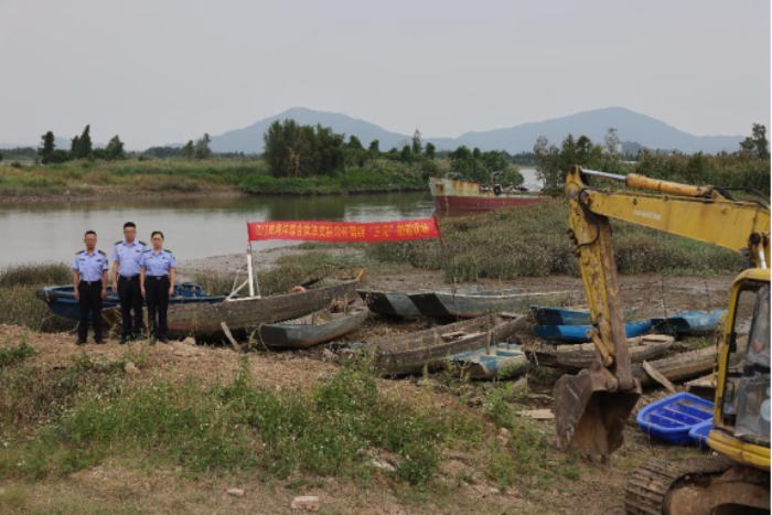 10月29日,市海洋综合执法支队在新会区双水镇上沙口集中销毁前期依法没收并完成公示手续的20艘涉渔“三无”船舶。