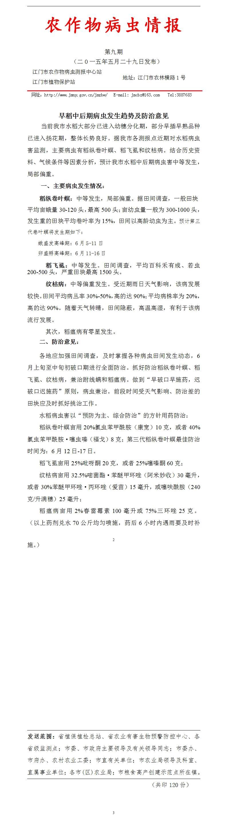 2015年农作物病虫情报第九期 (早稻中后期病虫发生趋势及防治意见)